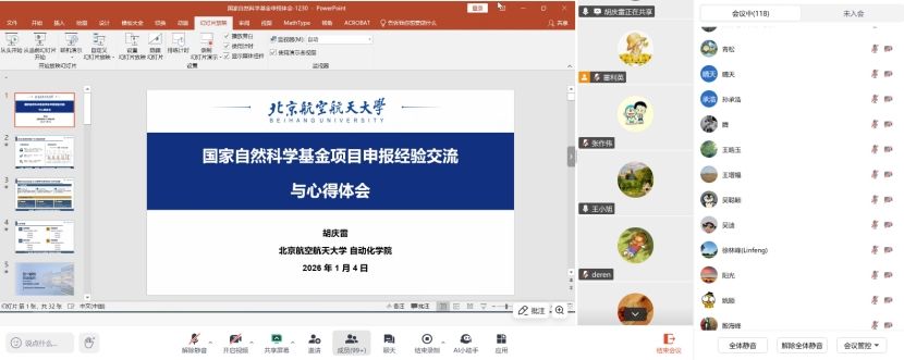 为进一步助力学院2026年度国家自然科学基金项目申报,1月4日下午,自动化学院举办国家自然科学基金申报专家讲座(第二场),邀请北京航空航天大学自动化科学与电气工程学院院长胡庆雷教授,通过线上和线下相结合的形式,作题为“国家自然科学基金申报体会”专题讲座。院内外教师130余名参加会议。会议由副院长王小旭主持。