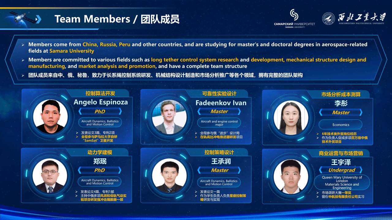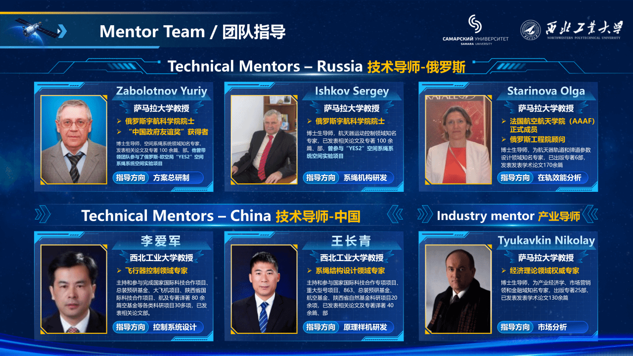 该项目由多名中俄学生共同参与完成,许诚嘉担任中方主要负责人,谢尔盖·伊夫列夫担任俄方主要负责人,其他成员有王承润、郑珉、Angelo Salvator Espinoza Valles、Ivan Pavlovich Fadeenkov、李彤和王宇泽。项目指导教师团队由陆宏湜、王长青、李爱军、郭永、易正阳、李航以及Zabolotnov Yuriy、Ishkov Sergey、Starinova Olga、Fadeenkov Pavel共同组成。