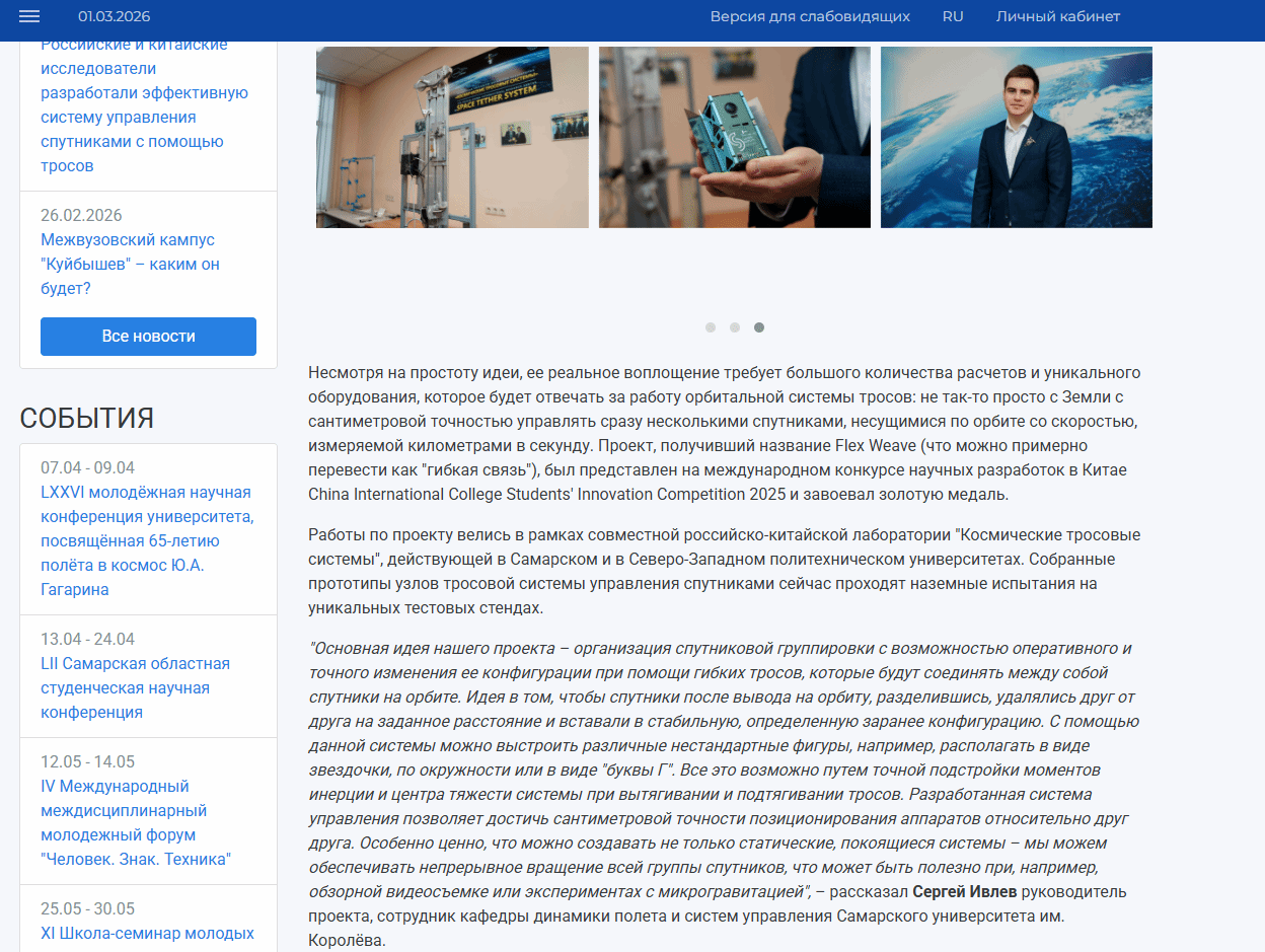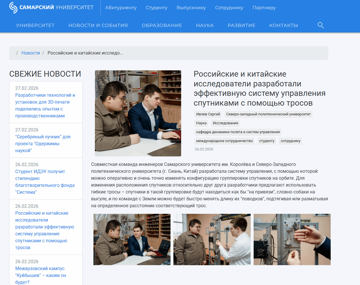 2026年2月26日,萨马拉大学新闻主页发布报道,介绍了萨马拉大学航空及火箭空间技术学院与西北工业大学自动化学院在人才联合培养与科研协同方面取得的重要成果。
