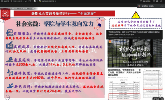 10月25日,自动化学院社会实践经验分享会在线上顺利举行。本次会议对我院2024—2025年度暑期社会实践成果进行了汇报,并邀请了优秀实践队代表进行经验分享,带领大家一同回望实践历程、感悟青春担当。学院团委书记李奥、各实践队负责人及学院部分同学参加了此次会议。会议由团委学习实践部白皓瑞主持。
