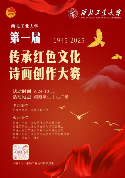 学生会文体中心联合航天学院、外国语学院、马克思主义学院与西北工业大学广播站,共同举办传承红色文化诗画创作大赛,活动以绘画与诗歌创作为载体,传承伟大抗战精神,展现了抗战时期重大历史事件中蕴含的民族气节与反侵略奋斗图景。