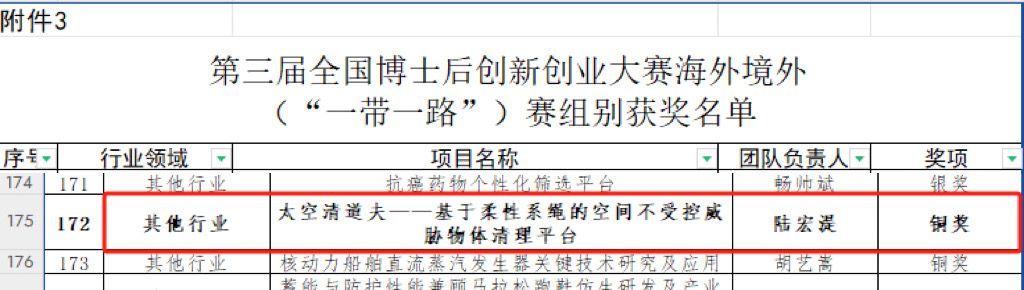 近日,第三届全国博士后创新创业大赛总决赛落下帷幕。自动化学院空间系绳与飞行器控制团队成员参赛项目《太空清道夫-基于柔性系绳的空间不受控威胁物体清理平台》,荣获第三届全国博士后创新创业大赛“海外境外”(“一带一路”)赛的“其他行业”赛道铜奖,这也是学院首次在该项全国性高水平赛事中获此佳绩。