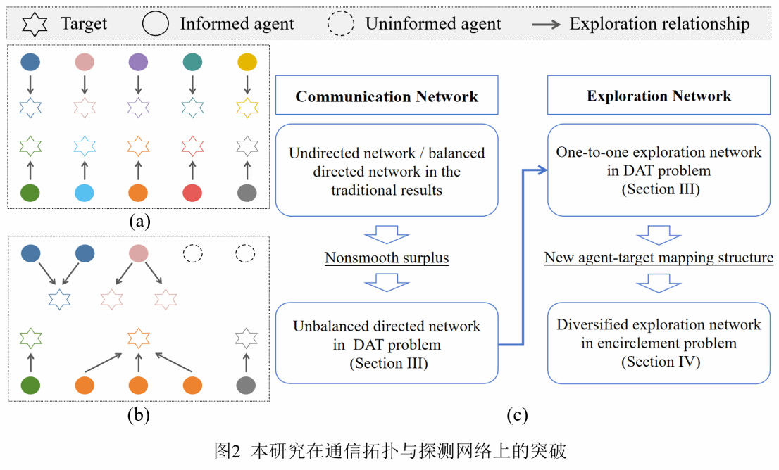 为验证算法的实际性能,研究团队将非光滑盈余分布式平均跟踪方法拓展于多样化探测网络中的非合作动态目标协同围捕任务。所提出的多样化探测网络突破了传统分布式平均跟踪方法对拓扑结构与智能体-目标探测关系“一对一”的严格限制(图2),实现了支持“一对一”、“一对多”、“多对一”等多样化探测情形的分布式平均跟踪。基于该场景开展的数值仿真表明(图3),算法运行稳定可靠,成功验证了其在非合作动态目标协同围捕方面的优越性能。该成果有望推动集群多样化协同探测、空间安全与人工智能等多个领域向更高效、更智能的方向发展。