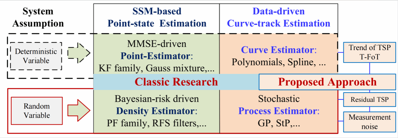 针对上述问题,西北工业大学李天成教授团队提出了一个从“目标跟踪(Target Tracking)”转向“轨迹定位(Targeting Track)”的全新理论框架,将目标轨迹建模为连续时间的函数形式,即“时间轨迹函数(Trajectory Function of Time, T-FoT)”,构建轨迹随机过程(Trajectory Stochastic Process,TSP)模型,从而能够在任意时间获得目标状态估计及其不确定性度量。团队自2014年以来持续在该思路框架下开展系列工作研究,近年来取得了阶段性突破,在Information Fusion、IEEE Trans. Signal Processing等国际权威期刊发表了系列背靠背论文。本工作是该系列工作的第三部分,前两部分近期发表于Information Fusion期刊(链接见:From target tracking to targeting track — part I: a metric for spatio-temporal trajectory evaluation - ScienceDirect;From target tracking to targeting track-Part II: Regularized polynomial trajectory optimization - ScienceDirect)。