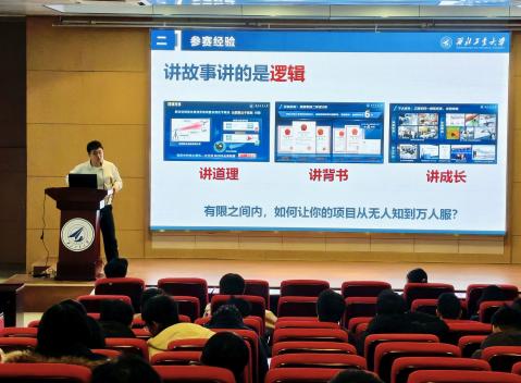 在经验分享环节,贾车旺结合自身夺冠实践,围绕网评材料打磨、团队组建与分工、赛程规划与项目迭代、路演技巧赋能等关键环节,分享了满满实操干货。他提到,备赛要紧扣评分规则、深耕科技前沿,巧妙运用“漏斗形叙事”逻辑——从行业大背景逐步聚焦至项目核心亮点,再延伸至应用场景与潜在价值,搭配形象贴切的比喻,让评委既能看懂项目、又能记住优势、更能认可潜力。