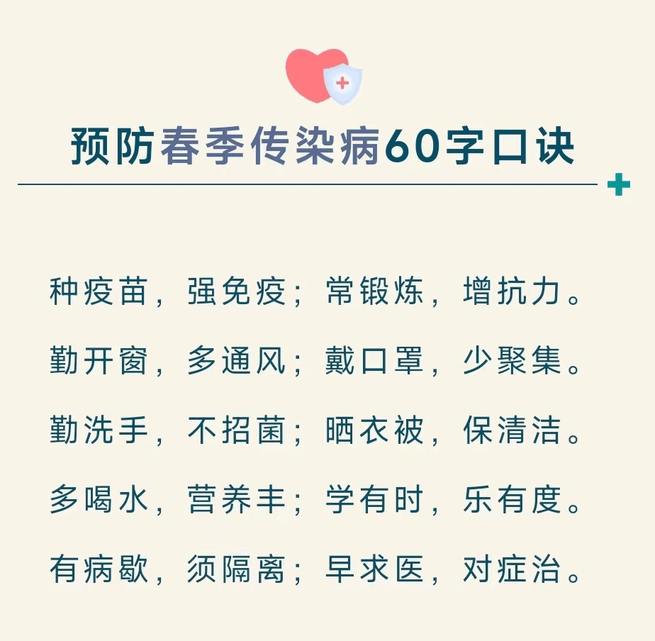 ·密切关注自身健康状况,警惕肺结核、流感、诺如等春季高发传染病,若出现发热、咳嗽、腹泻等不适症状,及时就医并向辅导员报备,不带病外出、不隐瞒病情。