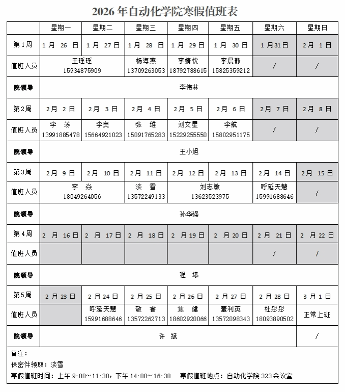 2.根据学校安排,值班时间:工作日上午9:00~11:30,下午14:00~16:30,值班地点:长安校区自动化学院323会议室,值班日期及人员安排见附件。