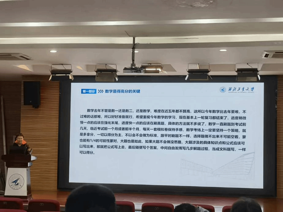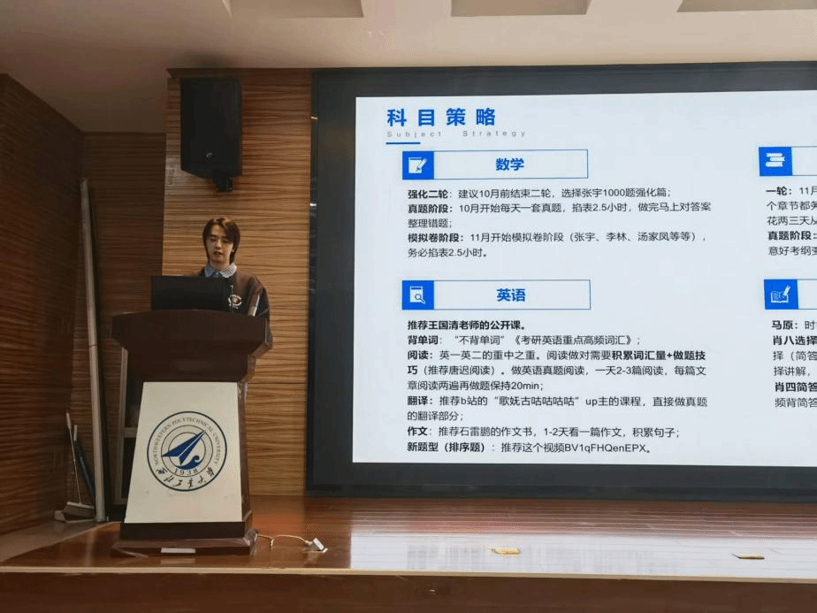 首位分享的是张良宇,他以389分考入本院仪器仪表工程专业。他结合自身备考经历,分享了各科目的复习策略:数学是拉分关键,每天保持刷题手感,考前坚持做模拟卷,考场上讲究策略。英语必须过线,坚持背单词、练阅读,准备作文模板。政治冲刺见效快,后期大量刷选择题,背诵分析题素材。专业课争取高分,反复刷课本习题和历年真题,考前模拟实战,保持答题节奏和检查习惯。考研前最后冲刺的两个月提升空间巨大,他鼓励大家坚持到底,全力以赴。