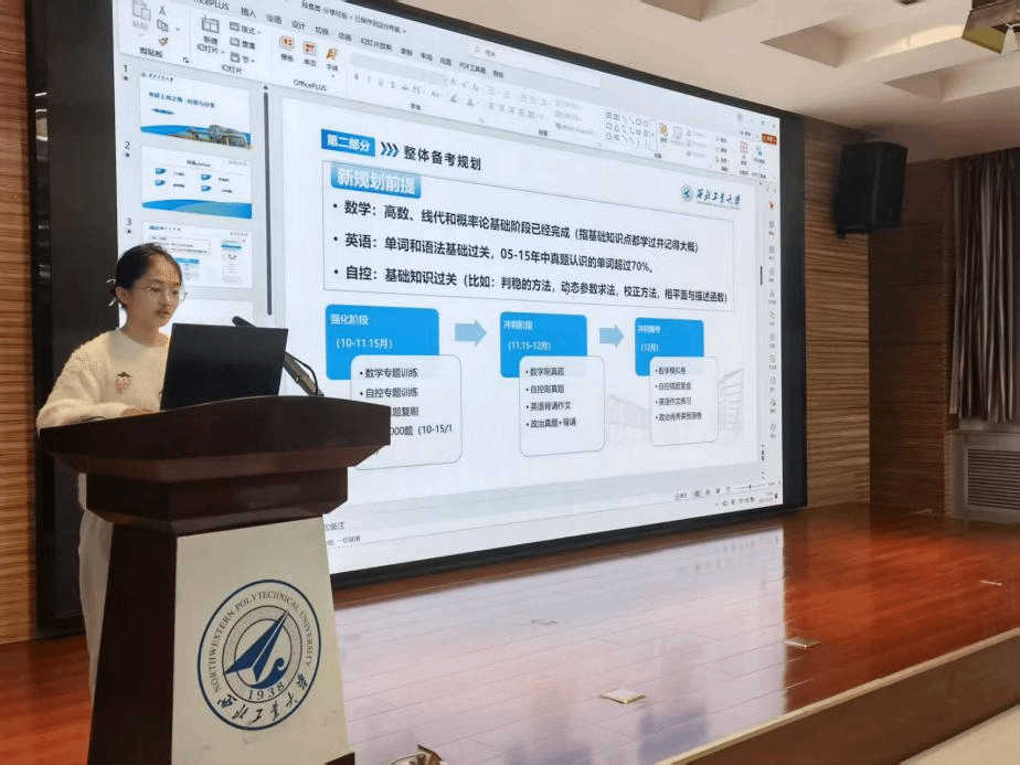 第二位分享的是段晨晨,她以405分考入本院控制科学与工程专业。她从三个方面分享了考研备考的宝贵经验:第一是备考安排,在数学复习中,她推荐关注一些高质量的线上学习资源,强化阶段可参考主流辅导课程与真题解析;英语备考则注重词汇积累和真题精读;政治科目建议结合经典习题集及刷题工具进行训练;专业课则可利用相关平台的每日习题推送,并加强真题模拟与错题复习。第二是学习方法,她强调要建立错题本,通过历年真题梳理出高频考点,总结出关键解题规范,定期复盘,避免重复犯错。第三是心态调整,“不要和别人比进度,只和昨天的自己比”,这是她始终坚持的原则。她建议大家接受备考过程中的焦虑和疲惫,通过运动、看电影等方式适当放松,保持劳逸结合。