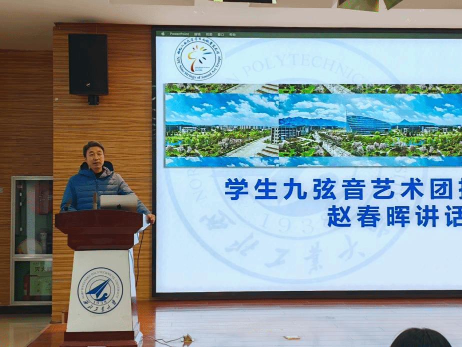赵春晖以“守正创新、工大精神”为主题,深情回顾了九弦音的成长历程,将九弦音的艺术风格与西工大的“总师育人文化”相结合,让九弦音的品牌在工大更加闪亮。