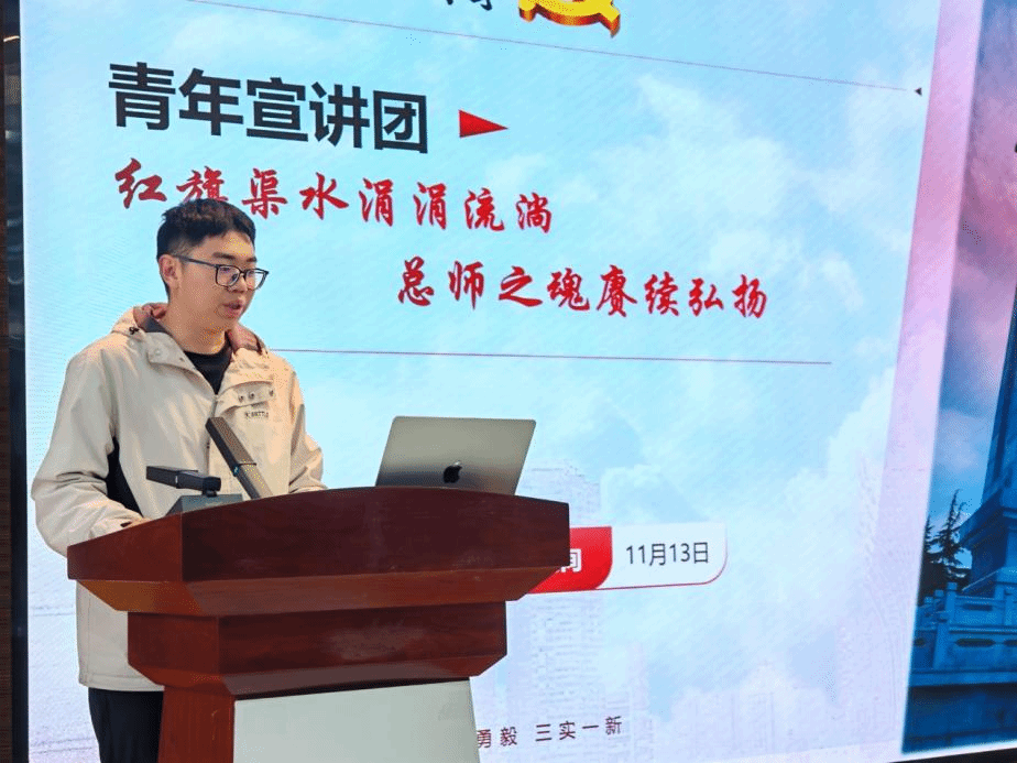 最后,青年宣讲团讲师张益沐带来了主题团日活动分享。他结合自身经历,以红旗渠实践经历为例讲述了新时代青年的责任与担当,激励在场同学将个人成长融入集体发展,以艺术表达传递青春正能量。