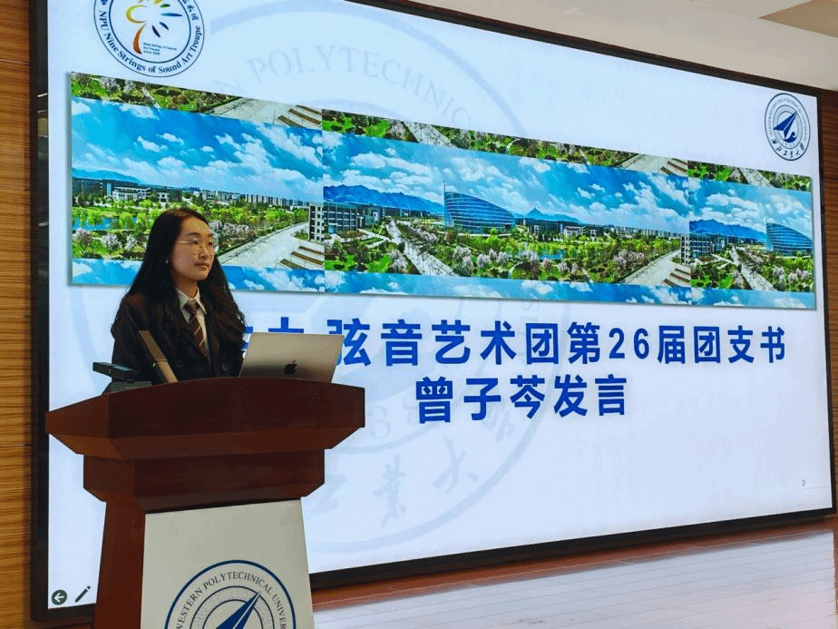 第26届团长李子琪同学系统阐述了工作规划与发展愿景,表示将秉承九弦音“艺术育人、服务校园”的宗旨,推动艺术创作与团队建设协同发展,并希望全体成员以热忱之心共筑艺术梦想。