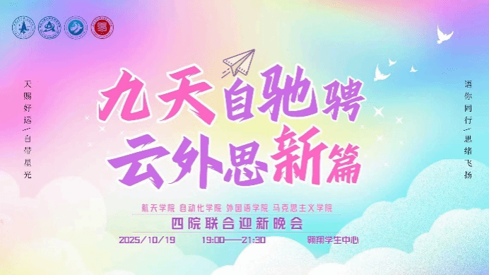 由学生会文体中心牵头,自动化学院联合航天学院、外国语学院、马克思主义学院,共同举办了“九天自驰骋,云外思新篇”四院联合迎新晚会。