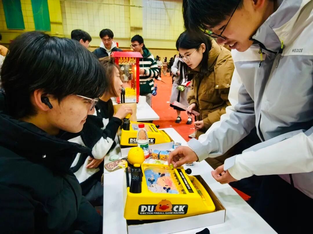 与云天苑餐厅的温馨相映成趣,翱翔体育馆副馆的元旦嘉年华活动现场同样热闹非凡。投壶、丢沙包、套圈等经典传统游戏区域前,同学们排起了长队,摩拳擦掌,跃跃欲试;弹珠机清脆的碰撞声此起彼伏,为新年增添了轻松欢快的气息。
