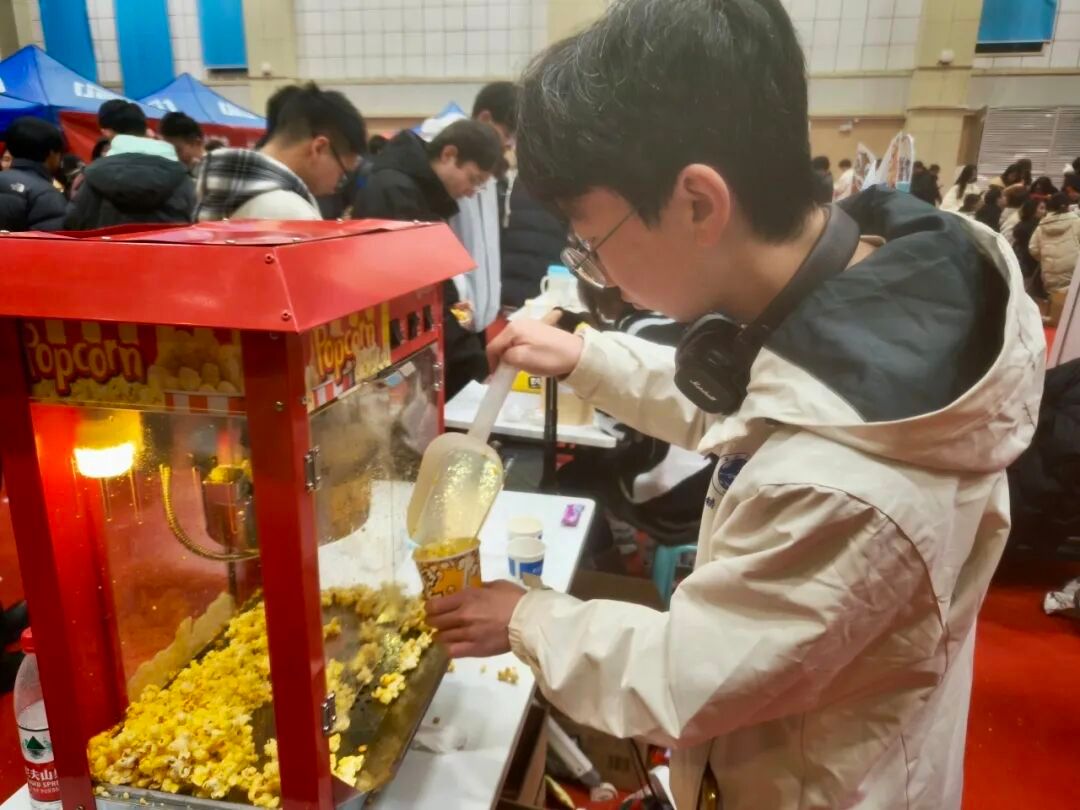 瞄准、投掷,在投壶区,同学们屏气凝神,体验着传统文化的独特韵味,即便未能投中,周围传来的鼓励与欢笑也让人暖意洋洋;弹珠机上,一颗颗弹珠在划出优美的弧线,满载着期待飞向目标,游戏唤醒了大家心底的童真,同学们在尽情玩乐中释放压力、收获快乐,欢声笑语回荡在体育馆上空。学院学生会的同学还为大家准备了爆米花、夹心饼干和可乐,作为奖品和休闲零食共同分享。